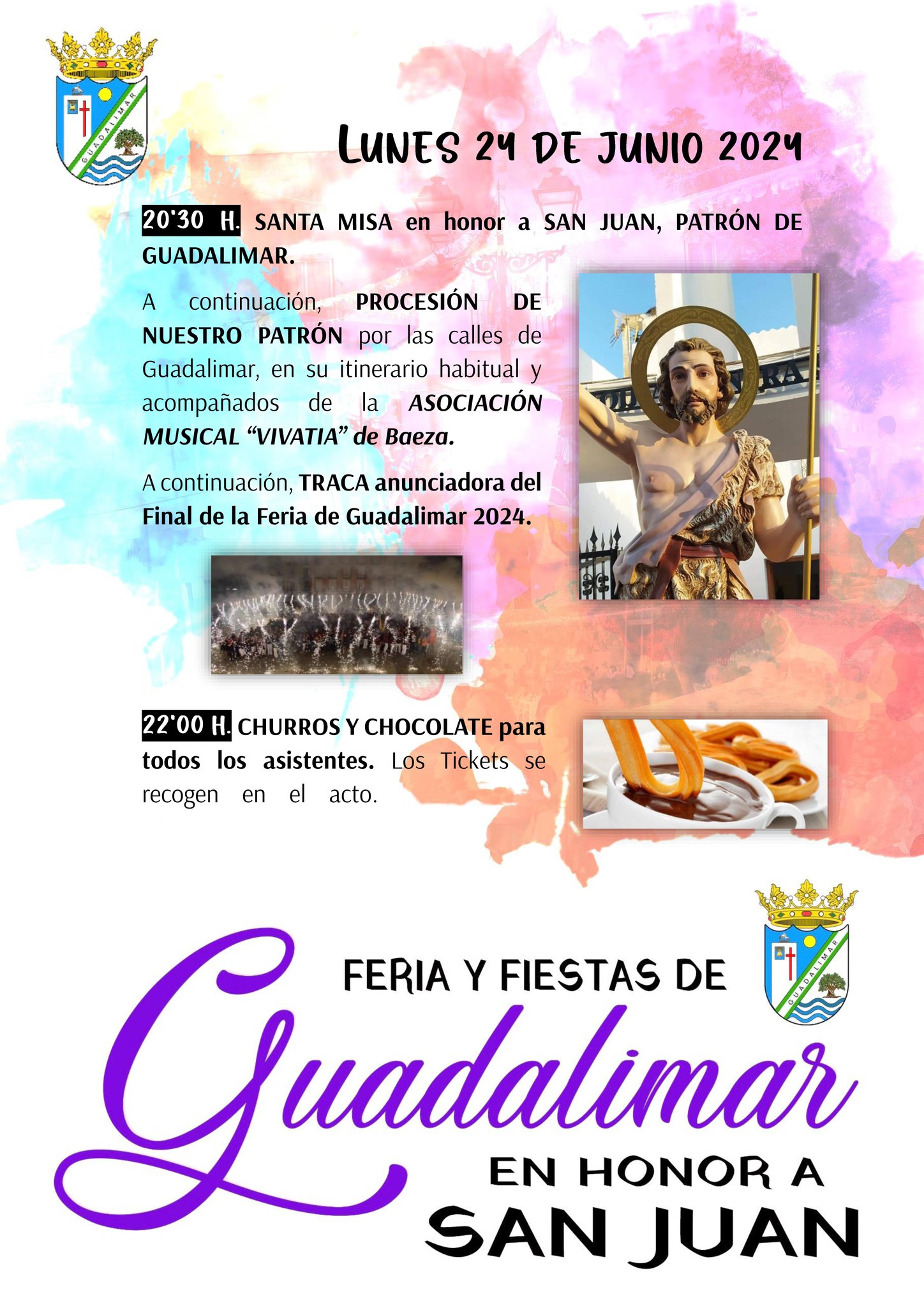 Los vecinos de Guadalimar disfrutarán de un largo fin de semana repleto de actos que culminará el lunes, día 24, con la solemne Misa que se celebrará en la parroquia Nuestra Señora del Pilar, a las 20:30 horas, en honor a San Juan Bautista, patrón de la localidad. A continuación, procesión de la imagen de San Juan por las calles de Guadalimar en su itinerario habitual, acompañados de la asociación musical Vivatia de Baeza. Terminada la procesión tendrá lugar la traca anunciadora del Final de la Feria de Guadalimar y la degustación de churros y chocolate para todos los asistentes.