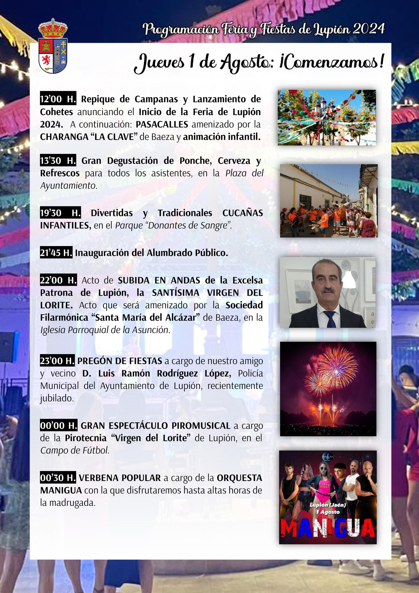El jueves, 1 de agosto, a las diez de la noche, tendrá lugar en la iglesia parroquial de la Asunción el emotivo acto de la subida en andas de la patrona de Lupión, Santísima Virgen de Lorite, un ritual que conmemora la llegada de la imagen de la Virgen a Lupión desde su lugar de origen, el paraje de «El Lorite», acto que será amenizado por la Sociedad filarmónica Santa María Alcázar de Baeza. A las once de la noche tendrá lugar el pregón de las fiestas a cargo de Luis Ramón Rodríguez López, policía municipal jubilado del Ayuntamiento de Lupión, y a las 12 de la noche el gran espectáculo de fuegos artificiales en el campo de fútbol.
